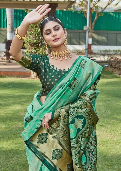 Elegant Light Green Banarasi Saree with traditional motifs.